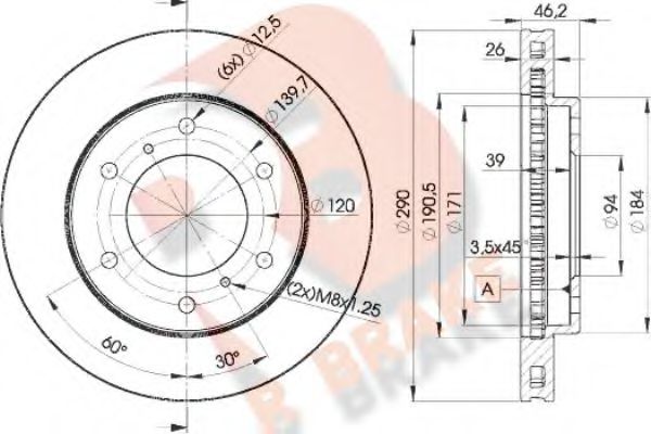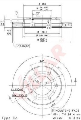 | | Тормозной диск Внутренний диаметр : 171 Высота [мм] : 46,3 Диаметр [мм] : 290 Диаметр отверстия [мм] : 12,8 Диаметр фаски 2 [мм] : 139,7 Диаметр центрирования [мм] : 94 Количество отверстий : 6 Минимальная толщина [мм] : 24,4 Сторона установки : Передний мост Тип тормозного диска : вентилируемый Толщина тормозного диска (мм) : 26 Показать больше свойств | |